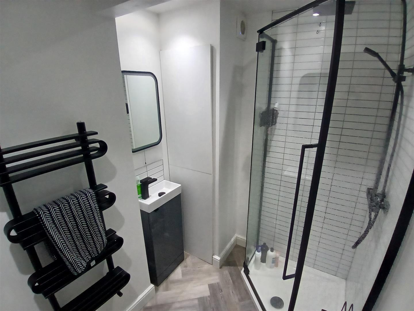 Fitted with a rainfall shower cubicle with screen, hand wash basin with mixer tap and storage beneath, WC and heated towel rail.