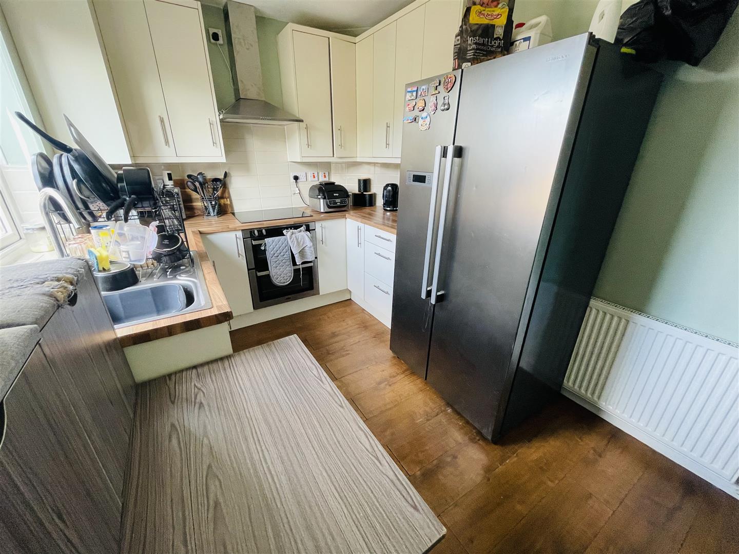Fitted with a matching range of base and eye level units with worktop space over, stainless steel sink unit with single drainer and mixer tap with tiled splashbacks, integrated washing machine, space for fridge/freezer, electric fan assisted double oven, four ring induction hob with extractor hood over, double glazed window to rear, radiator, wooden laminate flooring.
