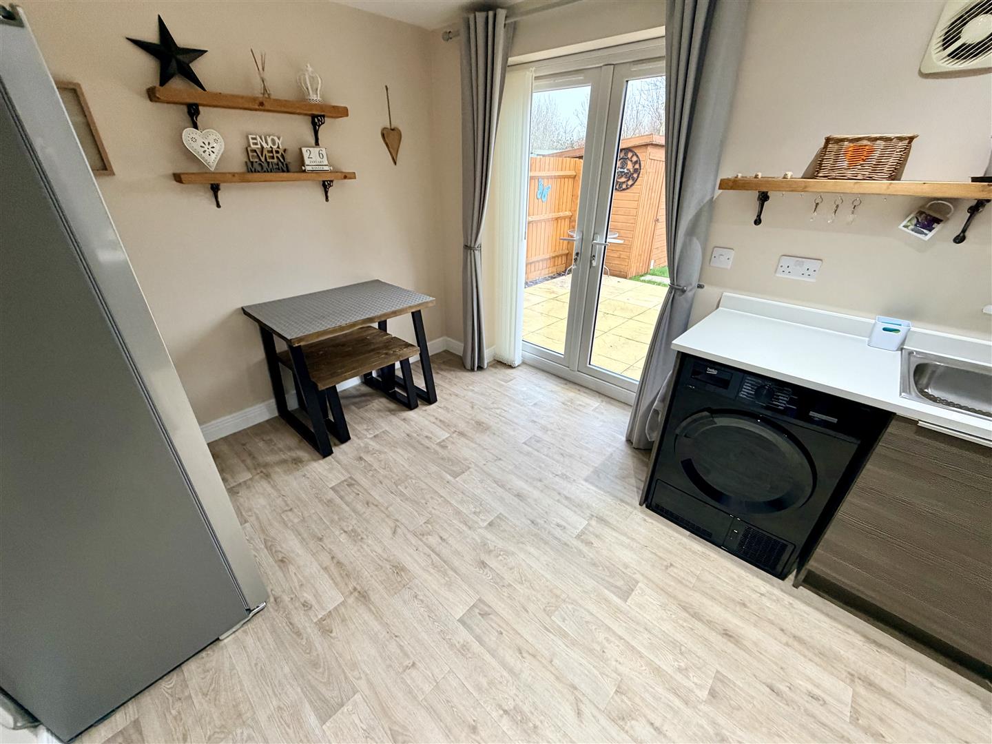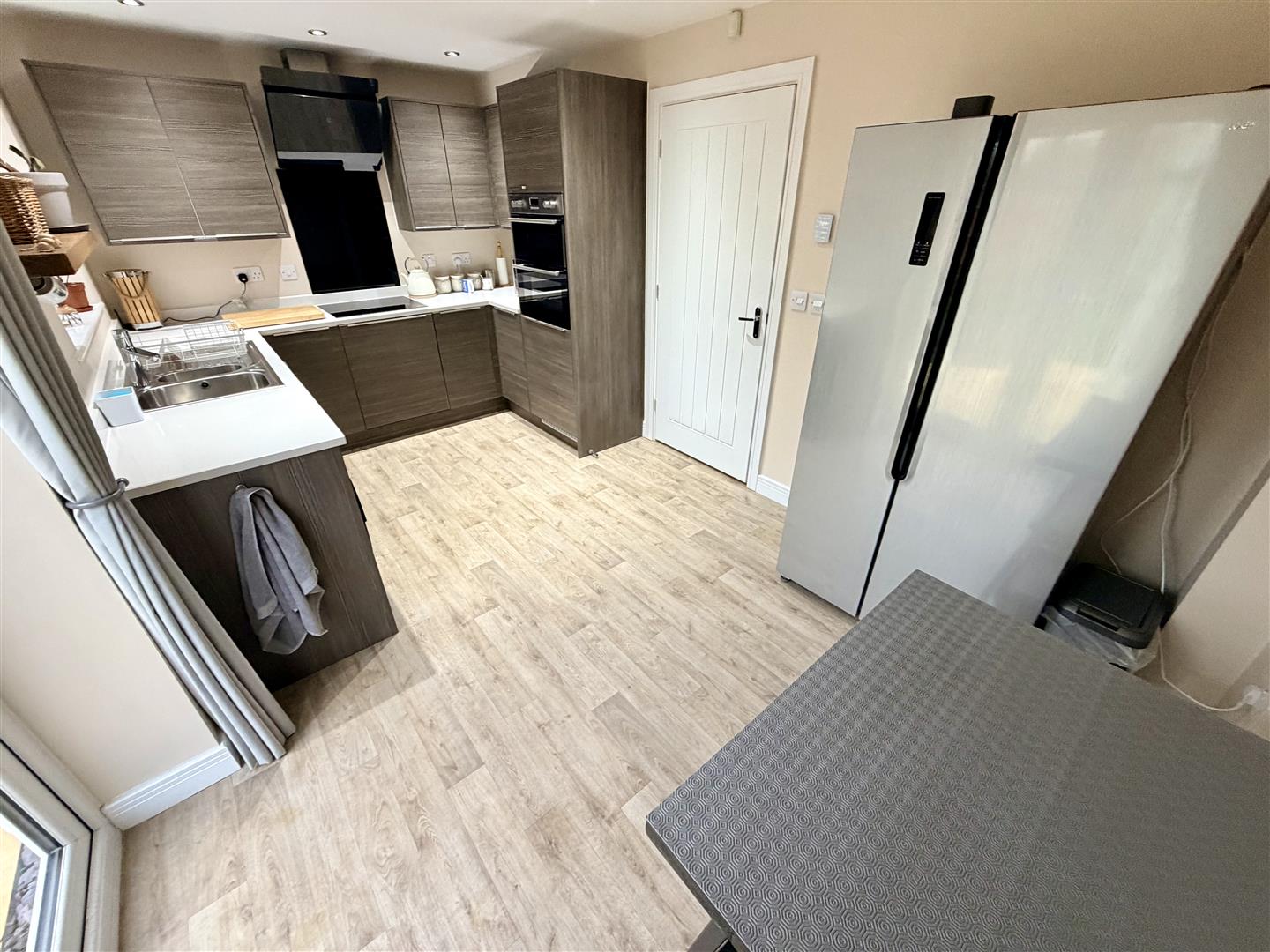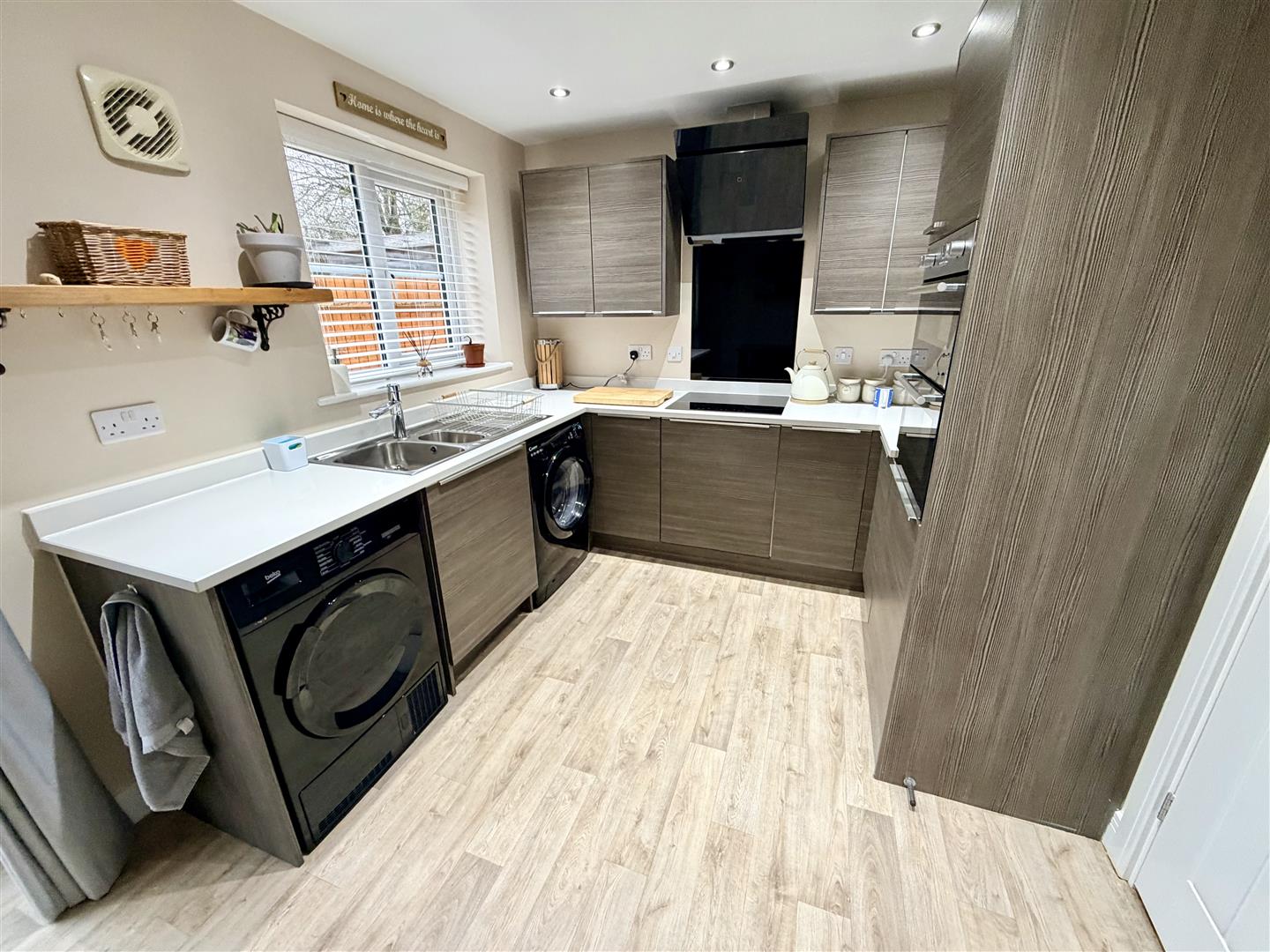 Fitted with a matching range of base and eye level units with worktop space over, 1+1/4 bowl stainless steel sink unit with single drainer and mixer tap, plumbing for washing machine and dishwasher, space for fridge/freezer, eye level electric fan assisted double oven, four ring hob with extractor hood over, double glazed window to rear, under floor heating, sunken ceiling spotlights, double glazed french double doors to garden.